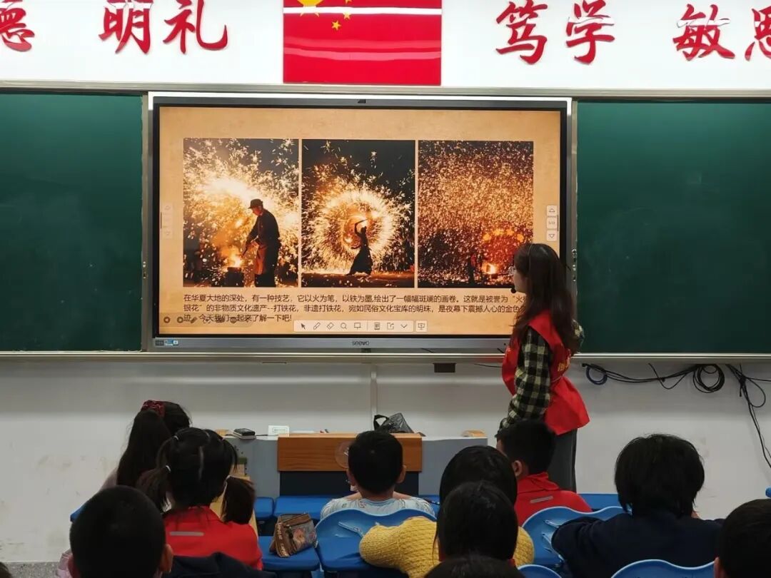 非遗国韵社把“火树银花”的打铁花非遗技艺,搬进了生动的课堂。 志愿者通过绚烂的图片,介绍这门“以火为笔、以铁为墨”的传统技艺。志愿者邀请孩子们一起拿起画笔,在纸上勾勒出自己心中的“铁花绽放”。红金交织的线条里,藏着非遗文化的绚丽与传承的温度。