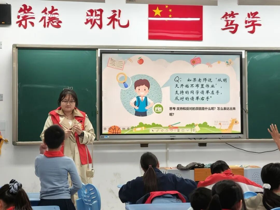 言值思辨社以“老师不布置作业”的趣味辩题,瞬间抓住了孩子们的注意力,带孩子用画“正”字投票互动,孩子们都沉浸在欢乐的课堂中,积极举手表达自己的观点。
