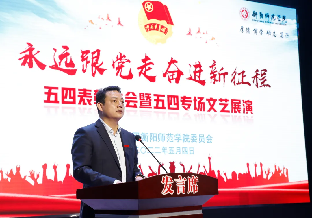 颁奖环节结束后,副校长魏晓林代表学校党委、行政向广大青年致以节日的问候和美好的祝愿,向受表彰的先进集体和个人表示祝贺。并对广大衡师青年提出了几点希望,要传承五四精神,坚定理想信念。衡师青年要坚信中国道路,坚守价值追求,坚定文化自信;要勤于学习实践,练就过硬本领。要增强学习的紧迫感,坚持学以致用;要砥砺奋进前行,勇担时代重任。在青春的赛道上勤勉耕耘,勇挑重担、勇克难关。